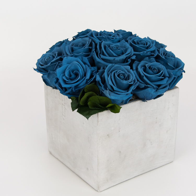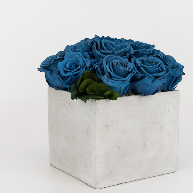 Kompozicija su mėlynomis miegančiomis rožėmis. Kompozicijos aukštis ir plotis apie 20 cm.