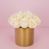Miegančių rožių kompozicija Creamy III aukso spalvos keramikiniame vazone. Kompozicijos aukštis apie 20 cm.