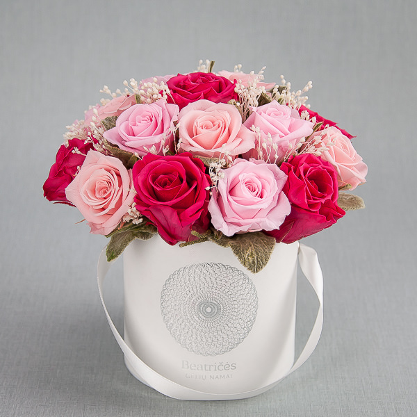 Stabilizuotų rožių kompozicija baltoje gėlių dėžutėje. Kompozicijos aukštis apie 17 cm.
