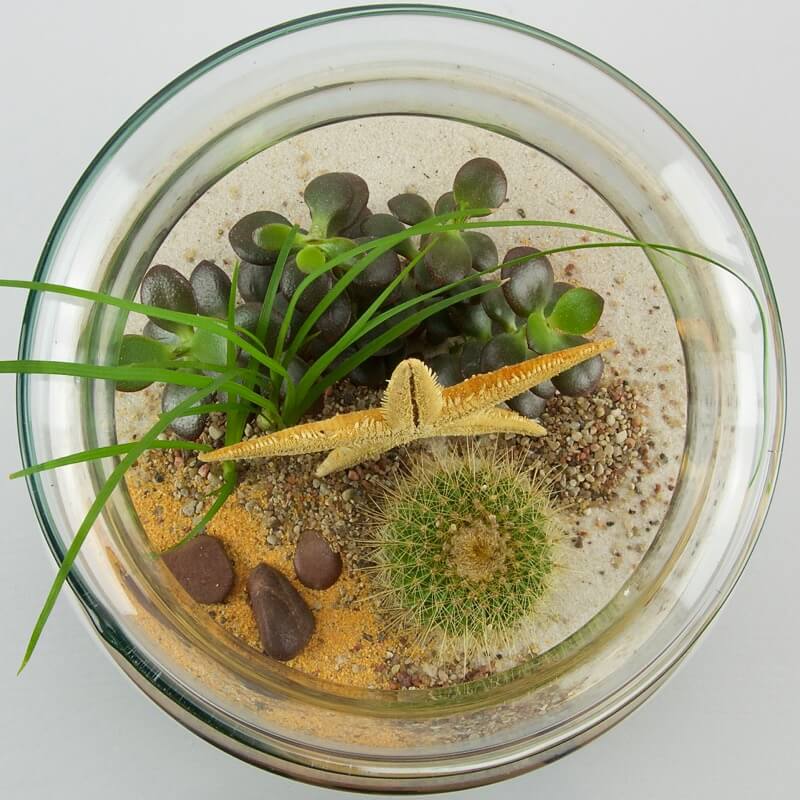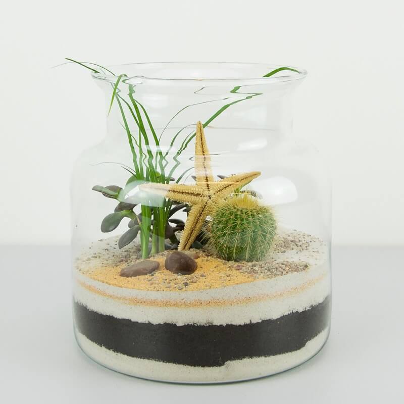 Sukulentų terariumas- originali alternatyva pakeičianti skintas gėles, ar net dovaną. Kompozicija nereikalaus daug priežiūros, tik truputi vandens ir saulėtos palangės. Terariume pasodinti kaktusas ir sukulentai, stiklo aukštis 19 cm.