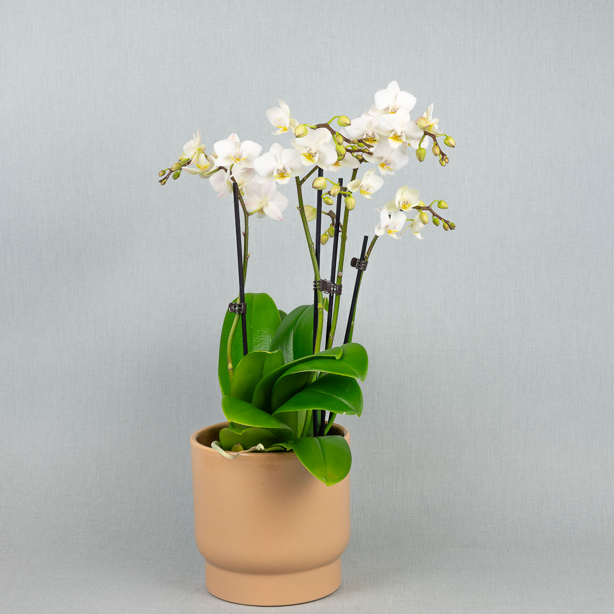 Белая маленькая орхидея в керамическом горшке. Высота композиции около 40 — 50 cm.