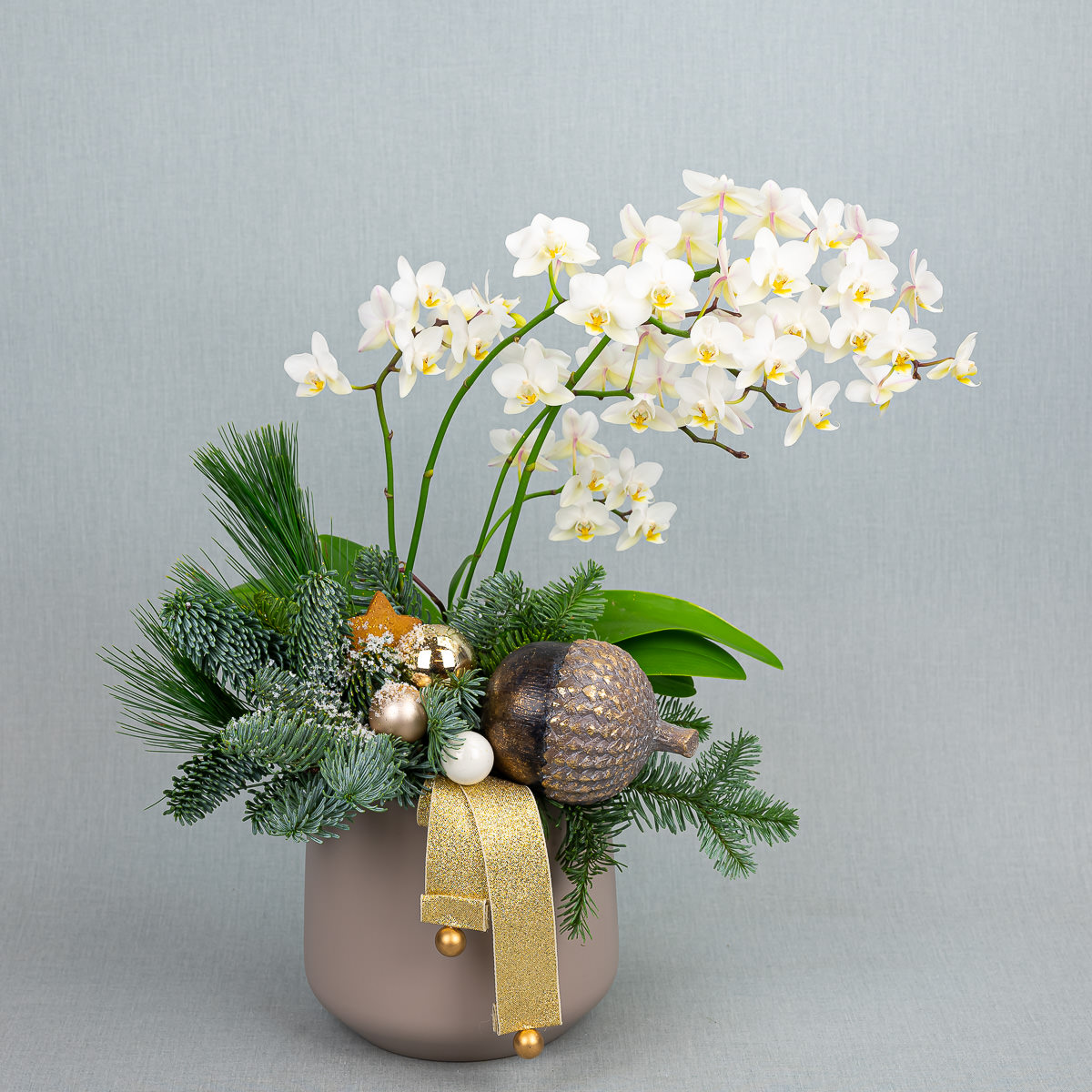 Белая маленькая орхидея в керамическом горшке. Высота композиции около 40 — 45 cm.
