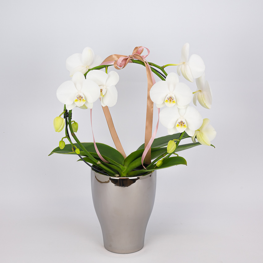 Белая орхидея в керамическом горшке серебряного цвета. Высота композиции около 35 — 40 см.